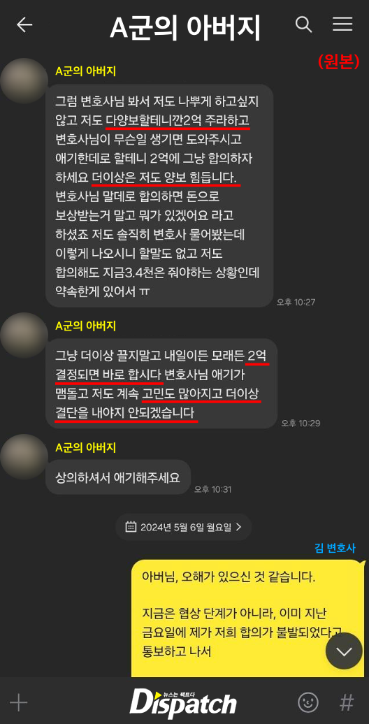 A군 부친 : 언론에 보도 되든 말든 신경 안 쓸 거면 2000, 3000에도 합의할 수 있어요.