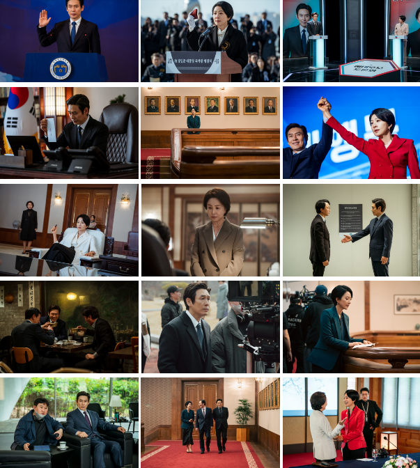 미공개 스틸에는 긴장감 넘치는 극 분위기부터 그와 정반대의 화기애애한 촬영 현장까지 담았다. 먼저 박동호(설경구 분)의 청와대 선서신과 정수진(김희애 분)의 추모식 연설신이 대비를 이뤘다.