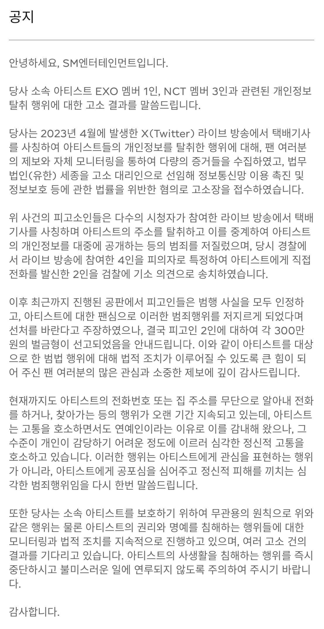 SM은 "아티스트를 대상으로 한 범법 행위에 대해 법적 조치가 이루어질 수 있도록 큰 힘이 되어 주신 팬 여러분의 제보에 깊이 감사드린다"고 말했다.