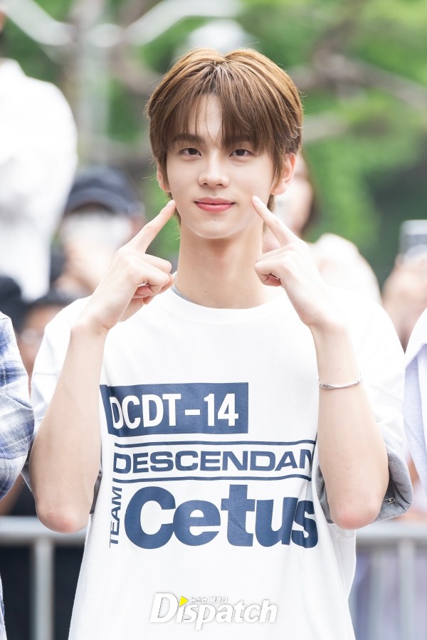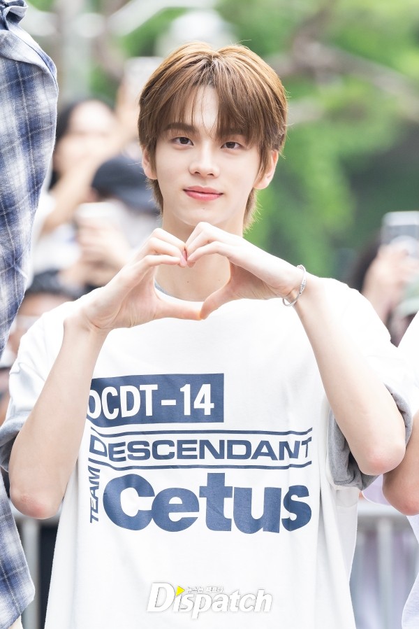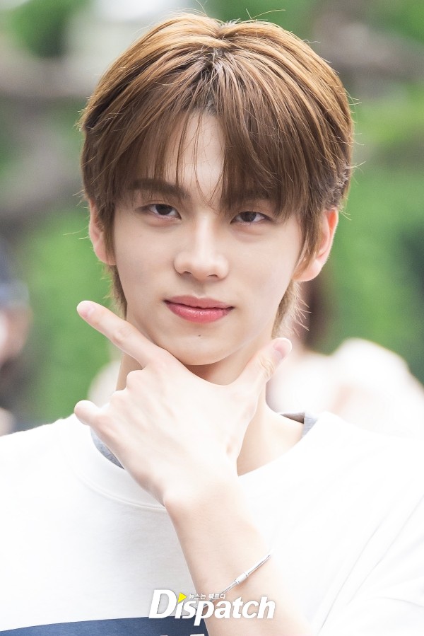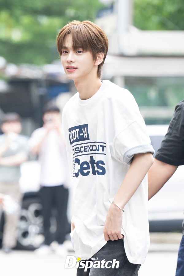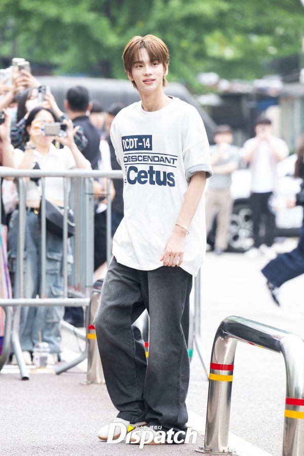 '투어스' 신유는 화이트 티셔츠와 데님 팬츠로 출근룩을 완성했다. 청량한 분위기가 돋보였다.