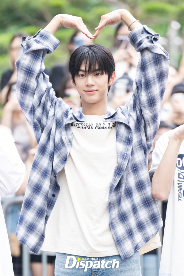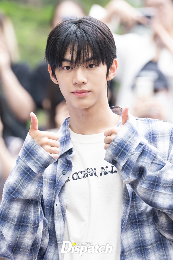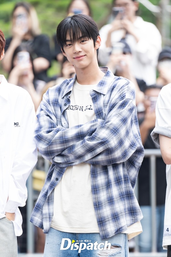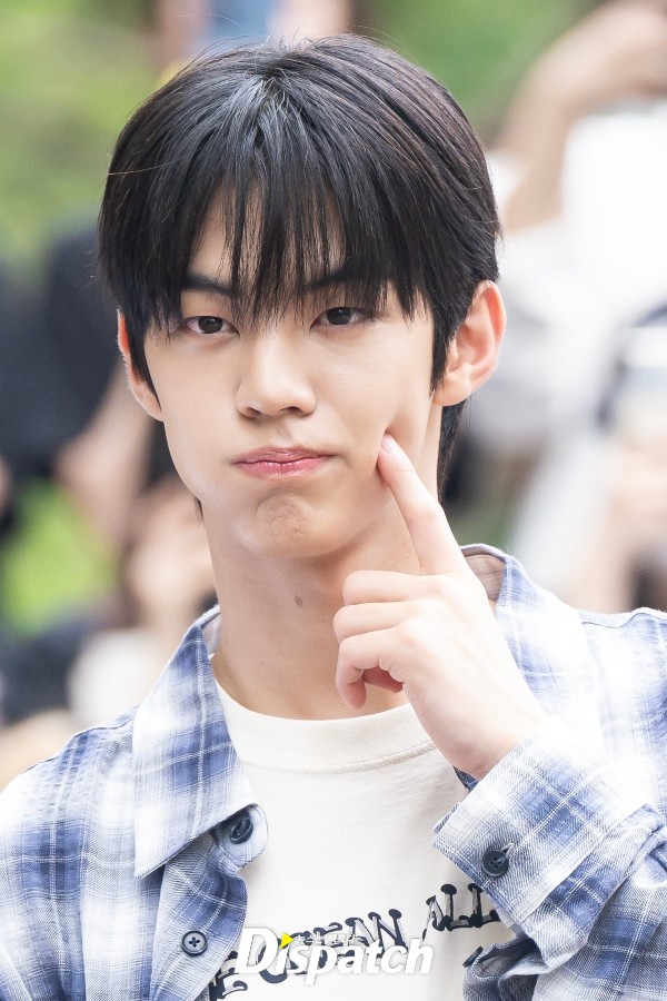 '투어스' 도훈은 블루 체크 셔츠로 청량한 분위기를 연출했다.