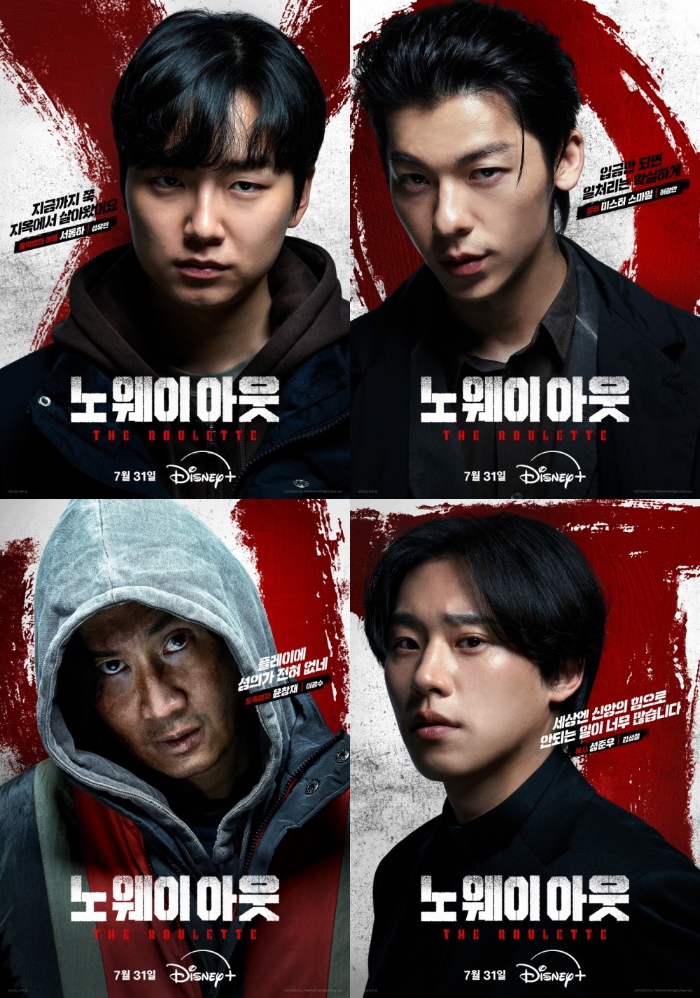 디즈니+ 측이 16일 '노 웨이 아웃 : 더 룰렛' 캐릭터 포스터 8종을 공개했다. 조진웅, 유재명, 김무열, 염정아, 성유빈, 허광환, 이광수, 김성철 등 주인공들의 모습을 담았다.