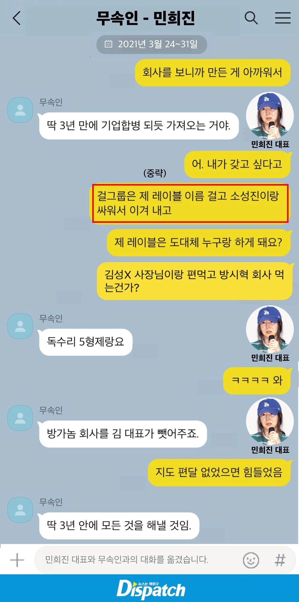 "데뷔 음반에 한해 제가 사전 수집, 기획한 내용이 있기 때문에 A&R 인볼브 수준을 협의해야 할 것 같습니다. 저희 팀 다음 주 휴가 뒤로 일정을 잡겠습니다." (민희진)