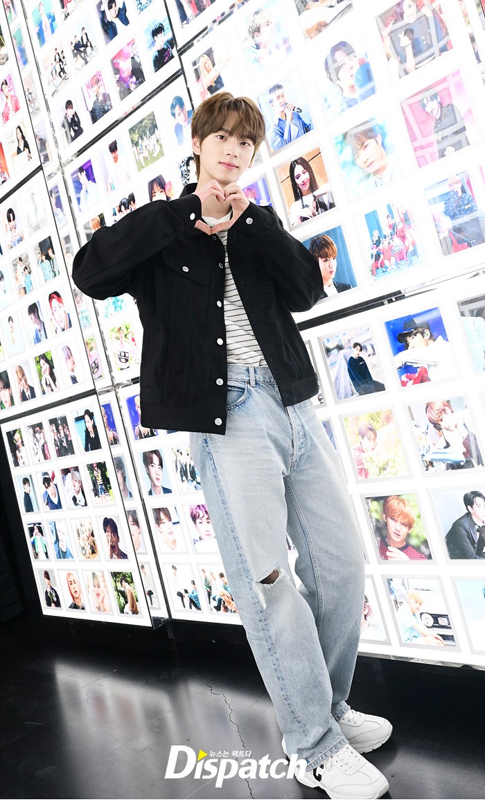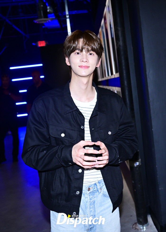 신유는 스트라이프 티에 블랙 데님 자켓을 입고 등장했다. 청량미를 완성했다. 부드러운 댕댕이 미소로 글로벌 팬들의 마음을 사로잡았다.
