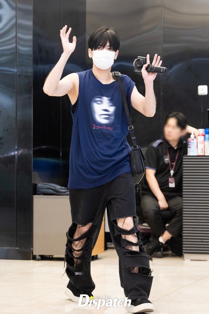 태현은 슬리브리스 티셔츠와 데미지진으로 멋을 냈다. 잘생긴 비주얼이 돋보였다.
