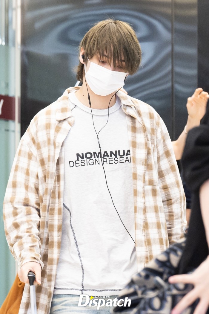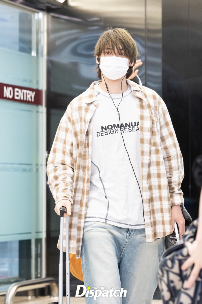 휴닝카이는 체크 셔츠와 데님 팬츠로 멋을 냈다. 잘생긴 비주얼이 돋보였다.