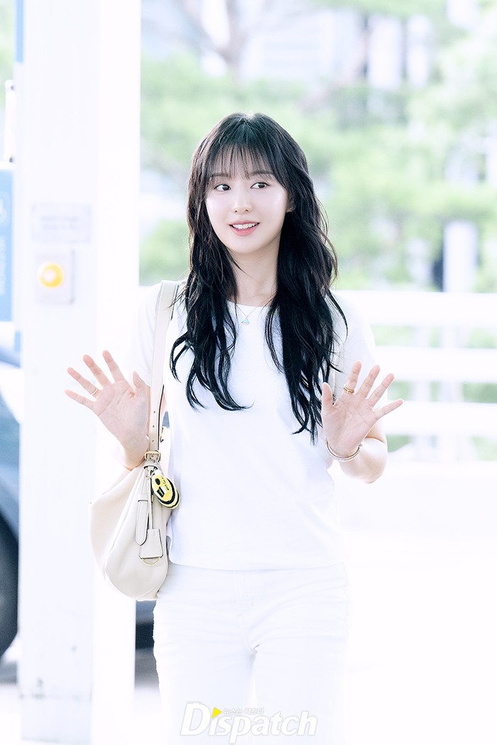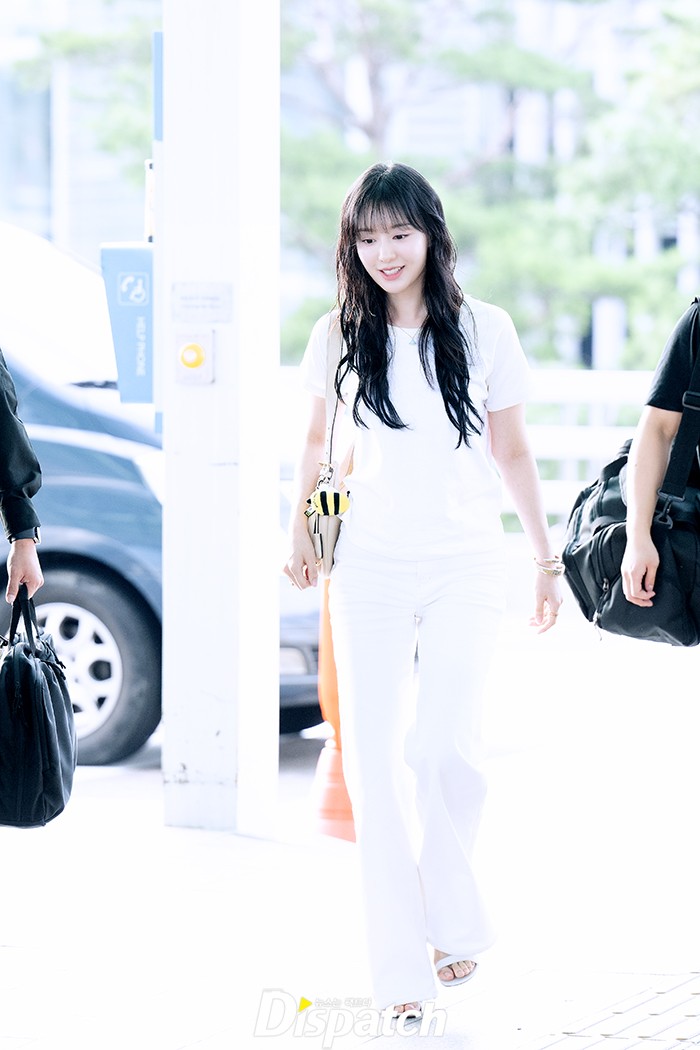 김지원은 화이트 룩으로 청순한 공항패션을 연출했다. 러블리한 미모가 돋보였다.