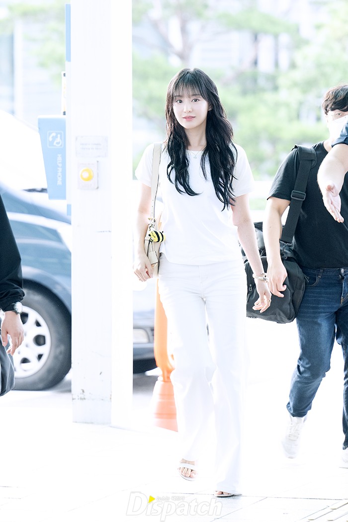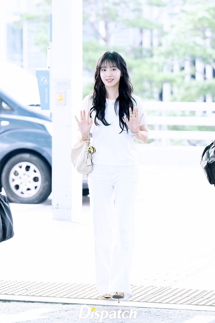 김지원은 화이트 룩으로 청순한 공항패션을 연출했다. 러블리한 미모가 돋보였다.