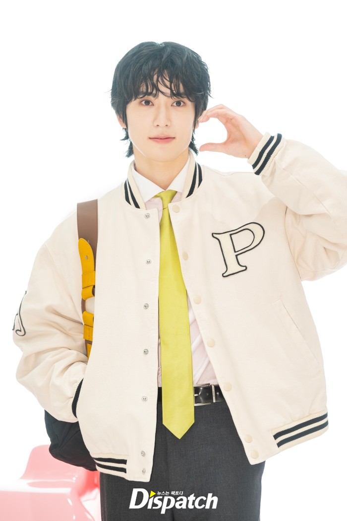 재현은 바시티 점퍼와 데님 팬츠로 멋을 냈다. 잘생긴 비주얼이 돋보였다.