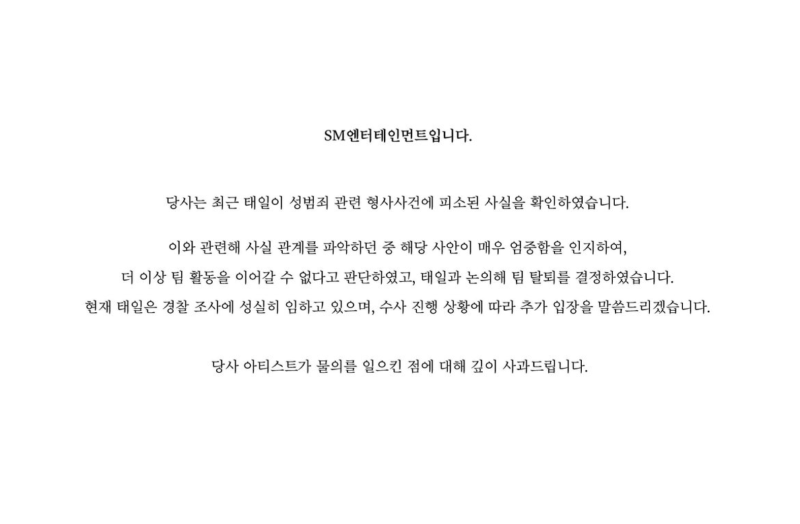 SM엔터테인먼트는 28일 "최근 태일이 성범죄 관련 형사사건에 피소된 사실을 확인했다"며 "사실 관계를 파악하던 중 사안이 매우 엄중함을 인지했다"고 밝혔다.