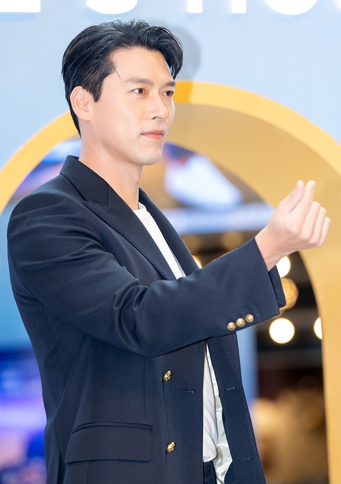 현빈은 네이비 수트와 스니커즈로 믹스 앤 매치 스타일을 보여줬다. 부드러운 미소로 여심을 사로잡았다.