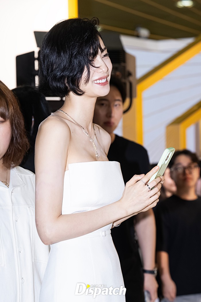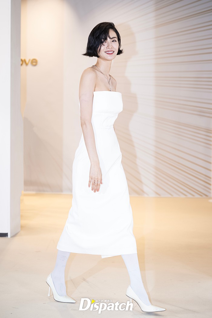 나나는 화이트 튜브톱 롱드레스로 우아한 자태를 뽐냈다. 숏단발 헤어스타일이 시크한 매력을 더했다.