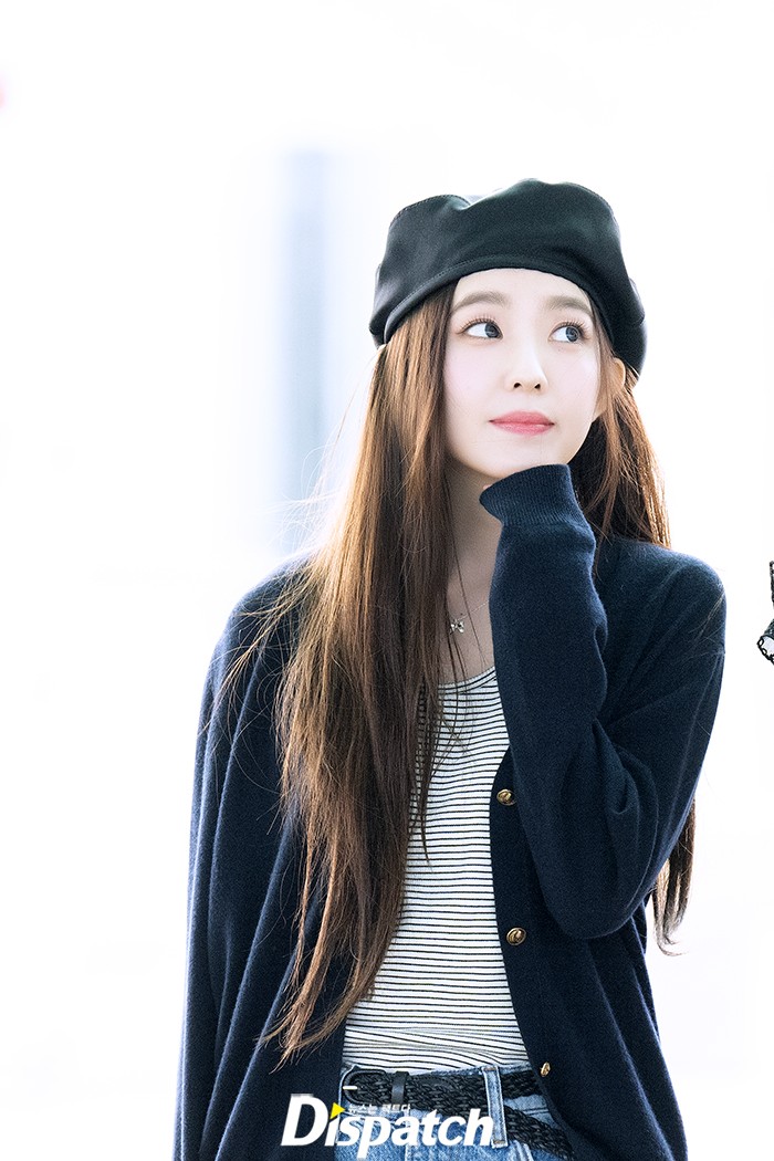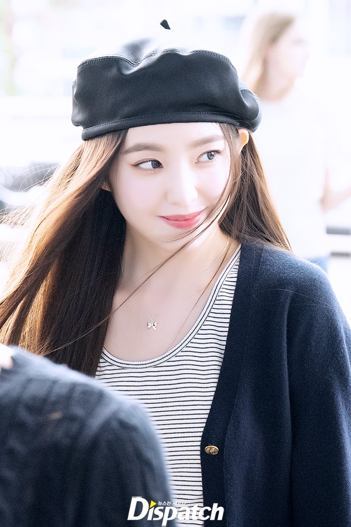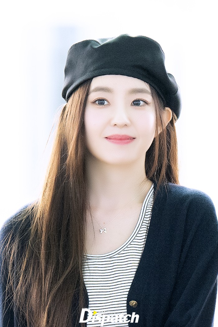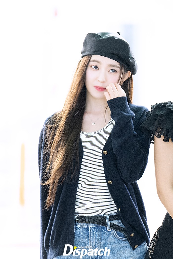 아이린은 데님 팬츠에 스트라이프 티셔츠, 가디건을 매치해 러블리한 공항패션을 연출했다. 인형같은 미모가 돋보였다.