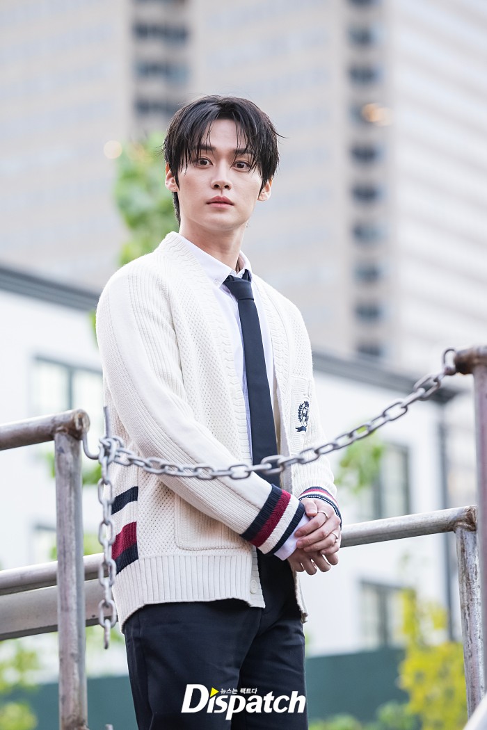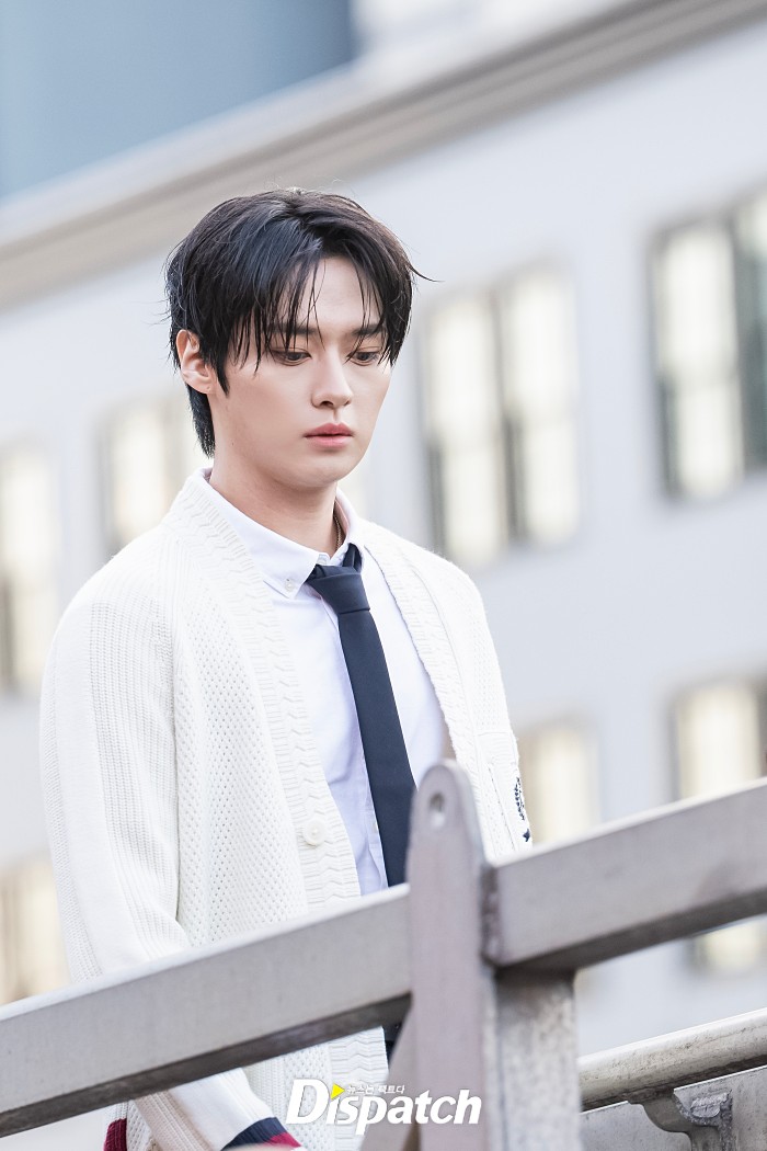 화이트 셔츠와 넥타이, 가디건으로 멋을 낸 리노는 완벽한 프레피룩을 선보였다.