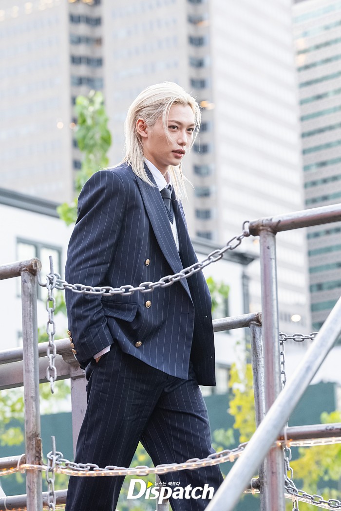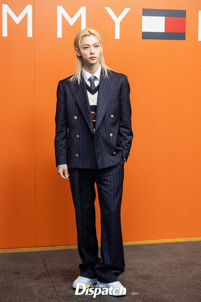 네이비 더블브레스트 수트를 착용한 필릭스는 완벽한 클래식룩을 선보였다.