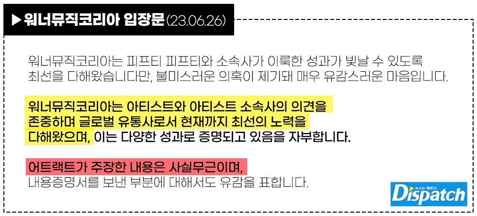 "워너뮤직코리아는 아티스트와 소속사 의견을 존중하며 글로벌 유통사로서 현재까지 최선을 다해왔습니다. 어트랙트의 주장은 사실무근이며…" (보도자료)