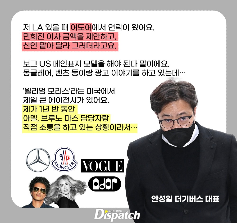 안성일 : 저 LA 있을 때 어도어에서 연락이 왔어요. 민희진 이사 금액을 제안하고, 거기 나오는 신인 맡아 달라 그러더라고요.