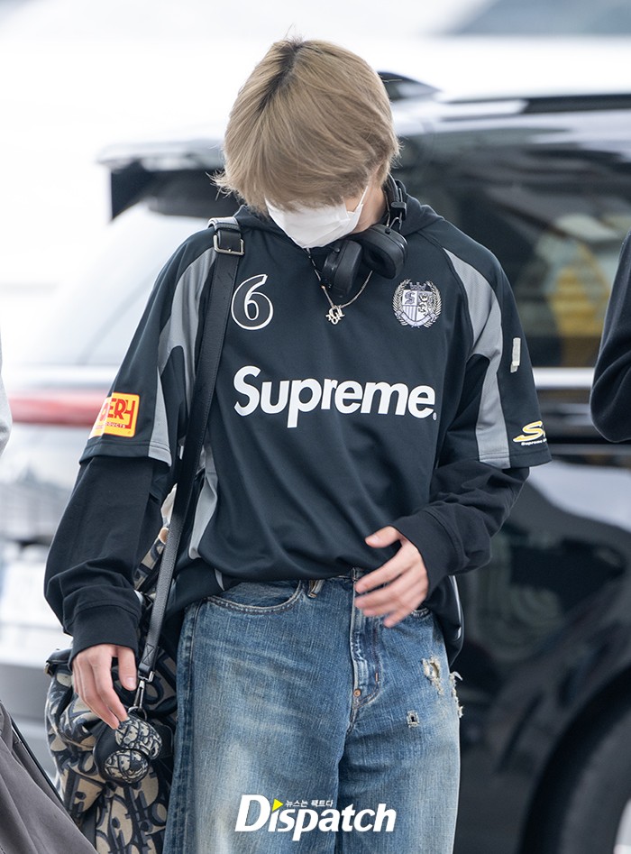 범규는 후디와 통큰 청바지로 힙한 스타일을 연출했다.