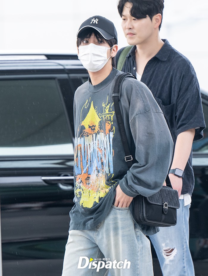 태현은 오버사이즈 셔츠에 볼캡으로 스타일을 완성했다.