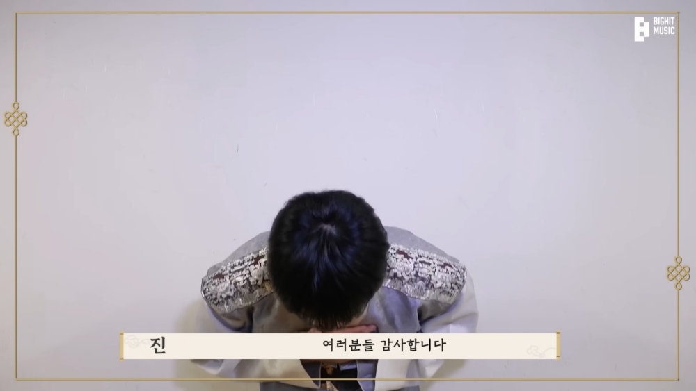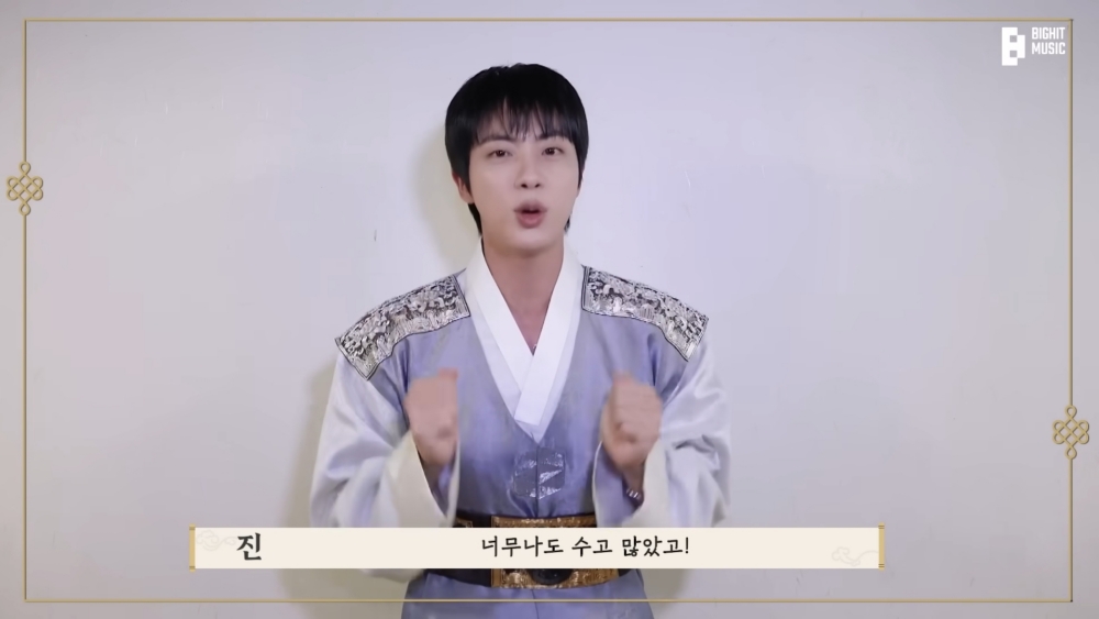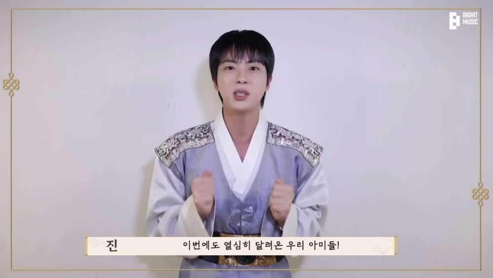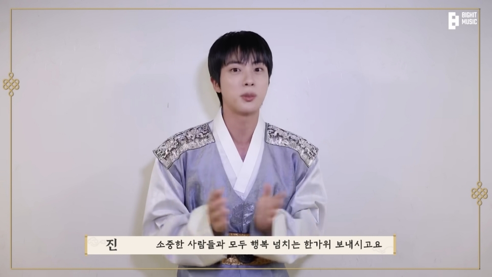 '방탄소년단' 진이 보라색 한복을 입고 특별한 명절맞이에 나섰다. 16일 팬 커뮤니티 플랫폼 '위버스'에 팬들을 위한 추석 인사 영상을업로드했다.