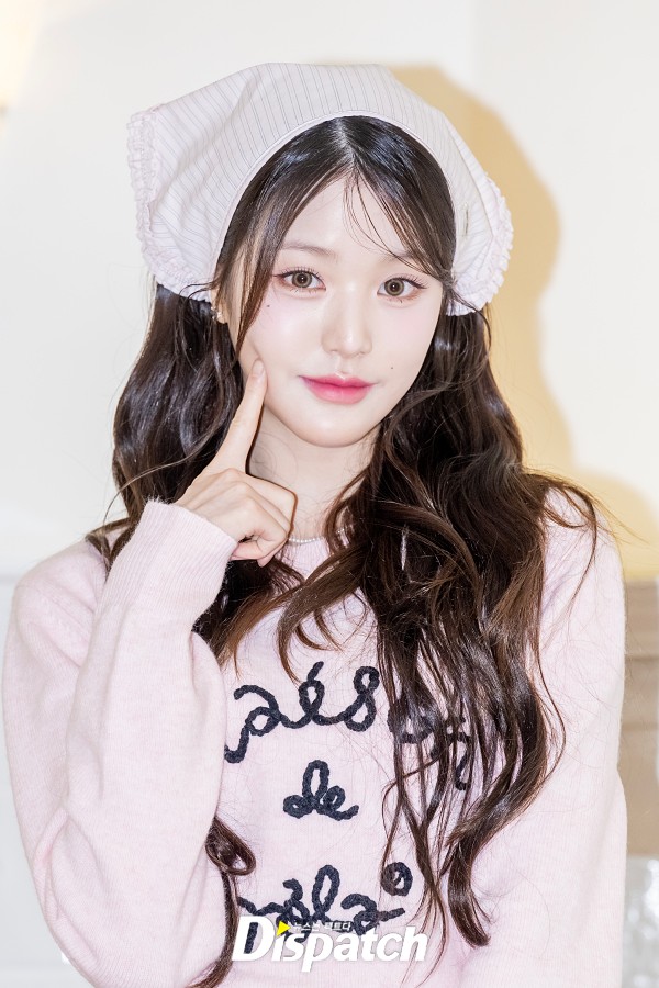장원영은 핑크 스웨터와 블랙 스커트로 페미닌 무드를 완성했다. 스카프 스타일링이 사랑스러움을 더했다.