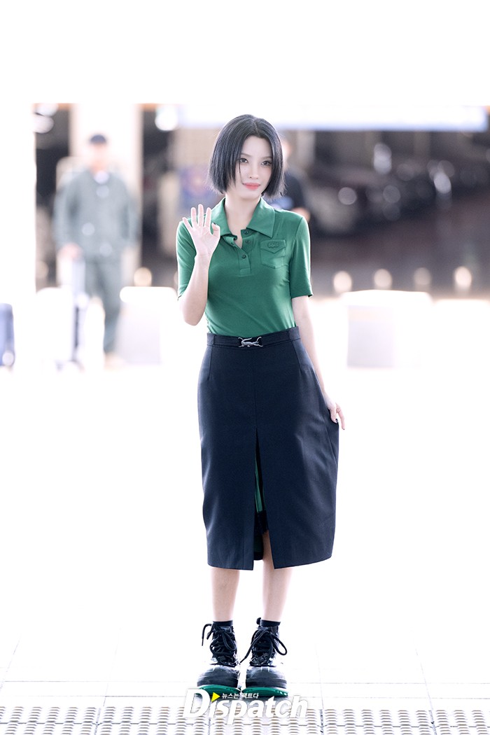 소연은 네이비 스커트에 그린 셔츠로 심플한 공항패션을 연출했다. 우아한 미모가 돋보였다.