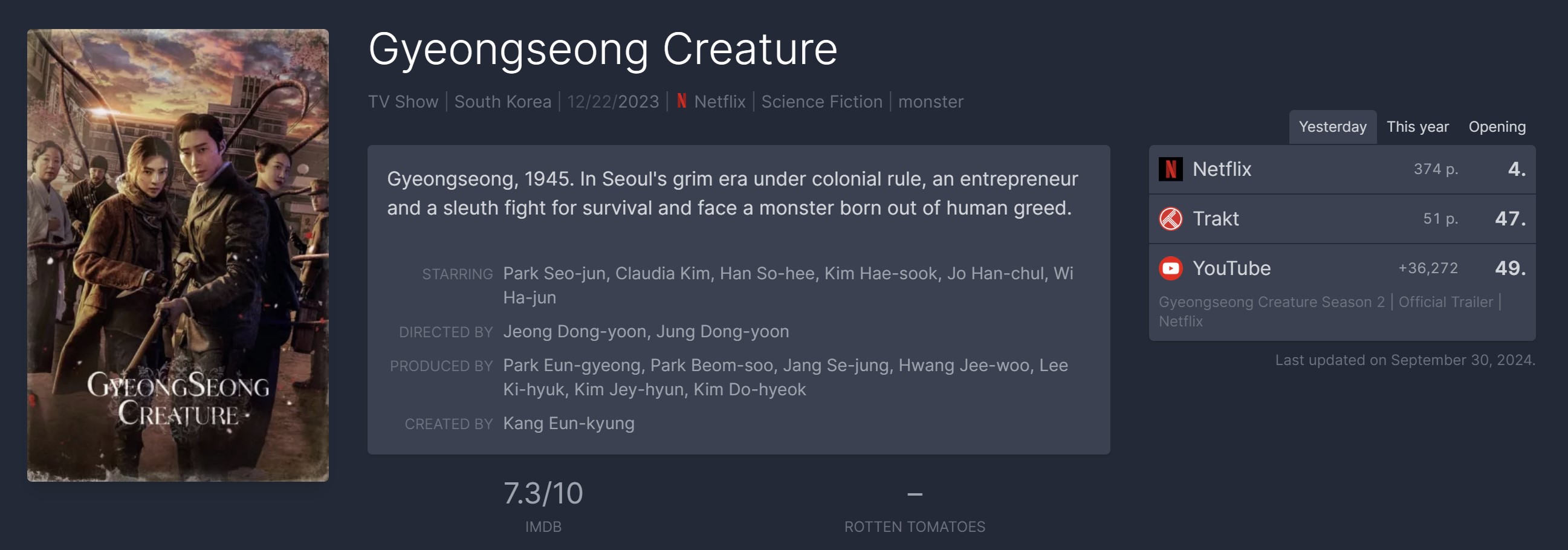 '경성크리처2'는 지난 27일 첫 공개됐다. 플릭스패트롤 최신 집계(9월 30일 자)에 따르면, 해당 작품은 '글로벌 톱 TV쇼' 부문 4위를 차지했다.