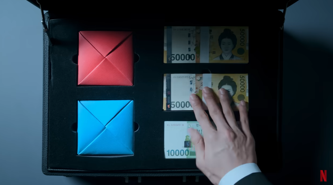 서류가방에는 빨간색과 파란색 딱지를 담았다. 5만원권, 1만원권 현금들도 준비했다. 공유는 '오징어 게임'의 명함도 품에 넣었다.