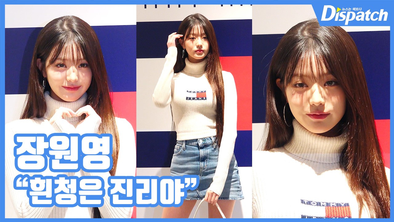 이날장원영은 화이트컬러스웨터와 데님미니스커트를 매치해 더욱 사랑스러운 젠지룩을 선보였다.