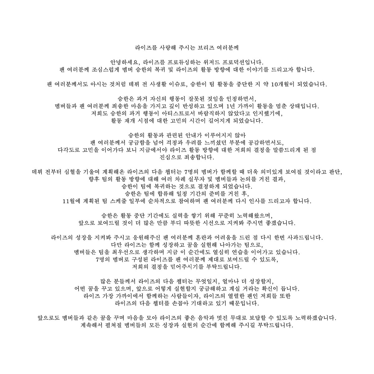 마지막으로 "라이즈는 함께 성장하고 꿈을 실현해 나가는 팀"이라며 "7명 멤버로 구성된 라이즈를 제대로 보여드릴 수 있도록, 저희 결정을 믿어주시길 부탁드린다"고 인사했다.
