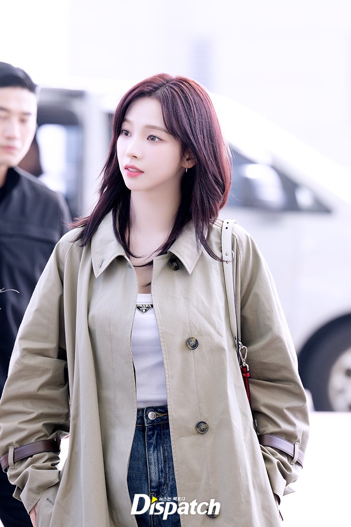 카리나는 데님 팬츠에 트랜치 코트로 우아한 공항패션을 연출했다. 인형같은 미모가 돋보였다.