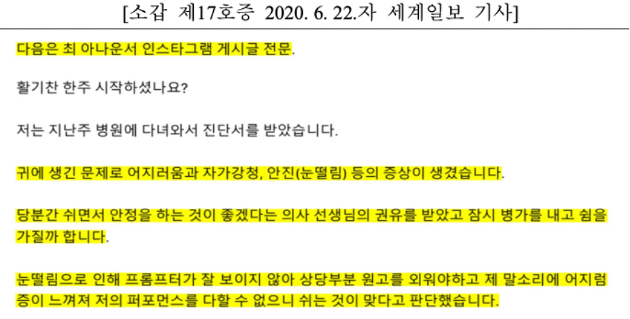 박지윤의 생각은 달랐다. 코로나 거리두기 사건과 동시에, 건강 상태도 악화됐다는 것. 실제로 최동석은 귀(고막)와 눈(떨림)에 문제가 생겨 뉴스를 진행할 상황이 아니었다.
