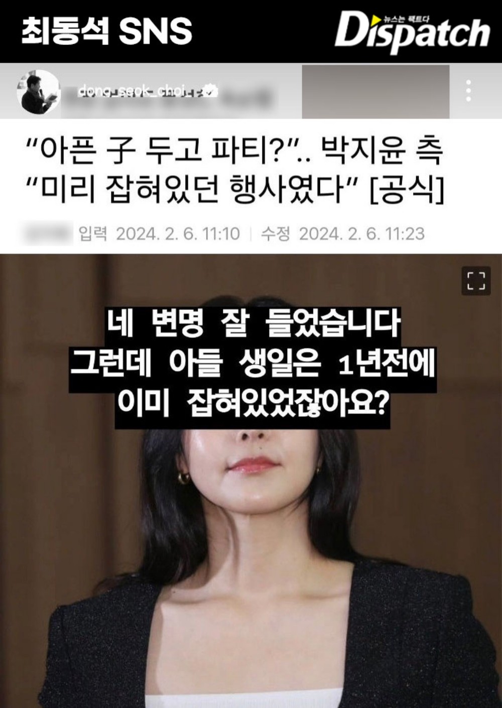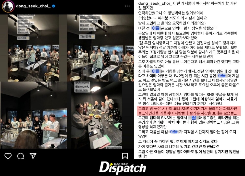 최동석은 2024년 2월, SNS에 "아들 생일에 꼭 그 자리(행사)에 갔어야 했니?"라고 지적했다.