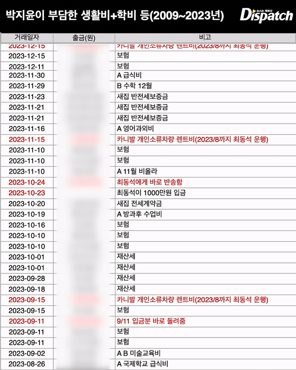 그리고 박지윤은 학비, 임대료, 생활비, 공과금, 세금 등 대부분을 감당했다. 가사 도우미 및 통학 기사 비용도 박지윤의 몫이었다.