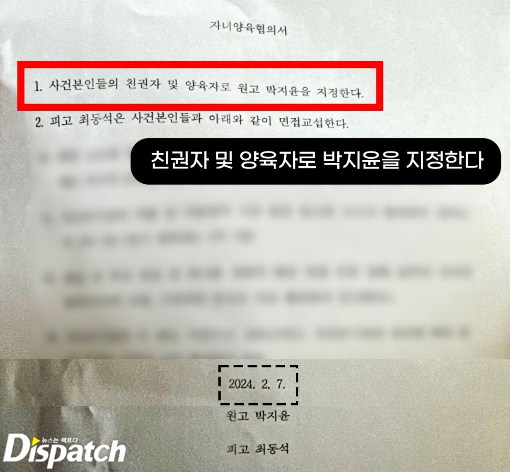 이미 박지윤이 양육권과 친권을 확보한 상태. (최동석은 2주에 1번씩 만날 수 있는 면접 교섭권만 갖고 있다.)
