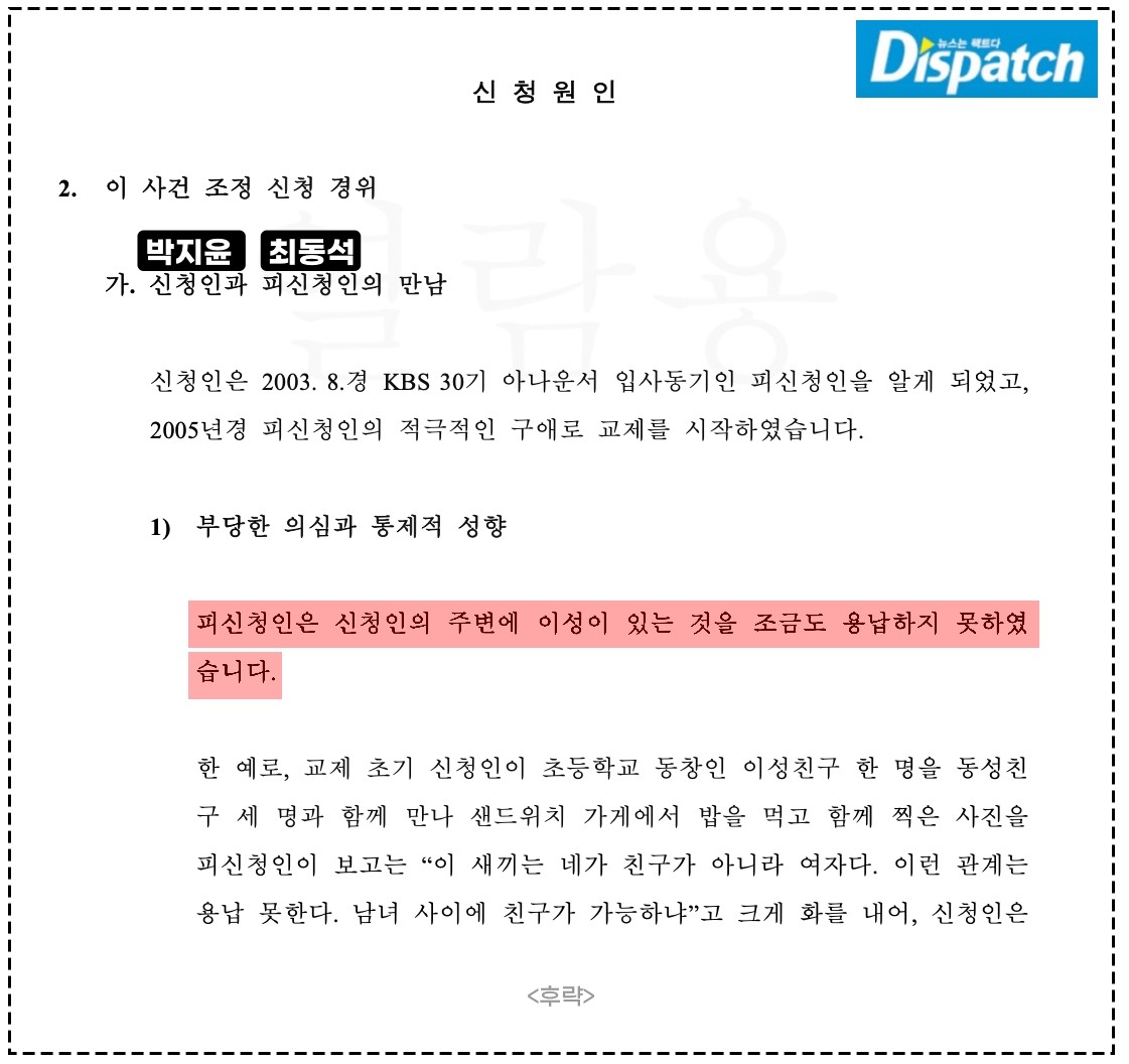 실제로, 최동석은 준비서면에서 신뢰파탄의 원인을 다음과 같이 말했다.