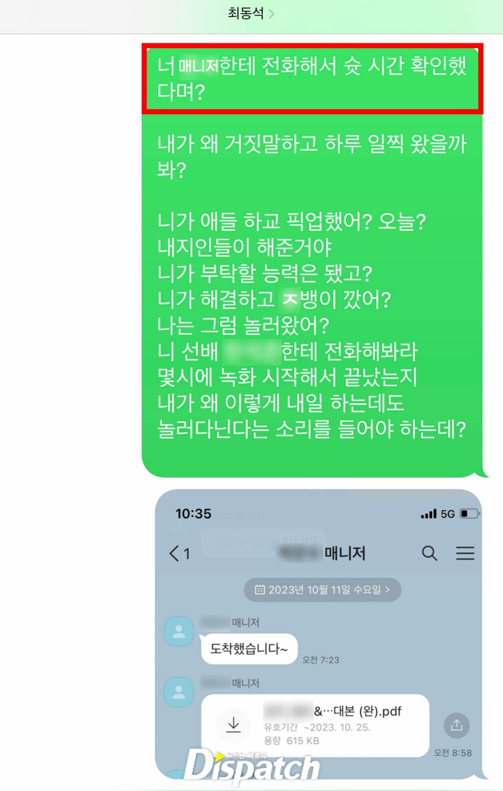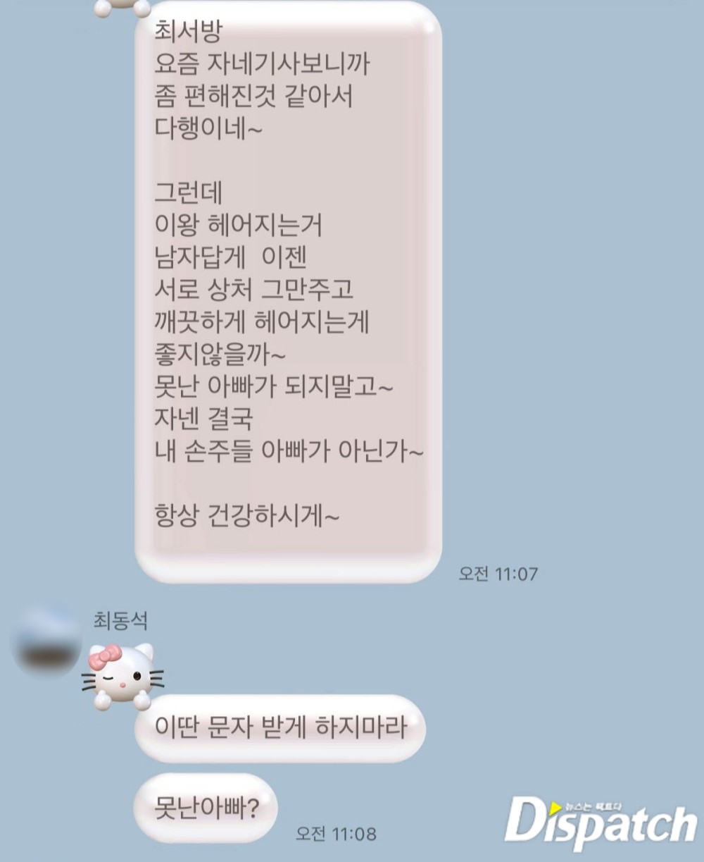 '디스패치'는 그날(5월 7일), 최동석과 장인이 나눈 문자를 통해 전후 사정을 알 수 있었다.