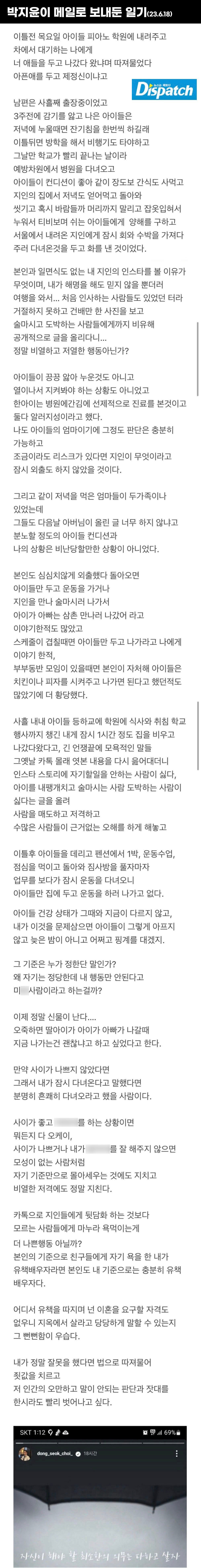 "생일 당일(4일)을 함께 보내진 못했습니다. 저는 일정이 있어 서울로 갔고, 친한 동생에게 아이들을 부탁했습니다. 이를 질타하시면 달게 받겠습니다. 그러나 최동석 씨의 공개 저격은... 더이상 말하지 않겠습니다." (박지윤)