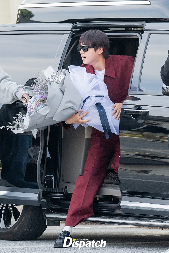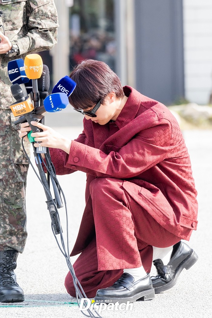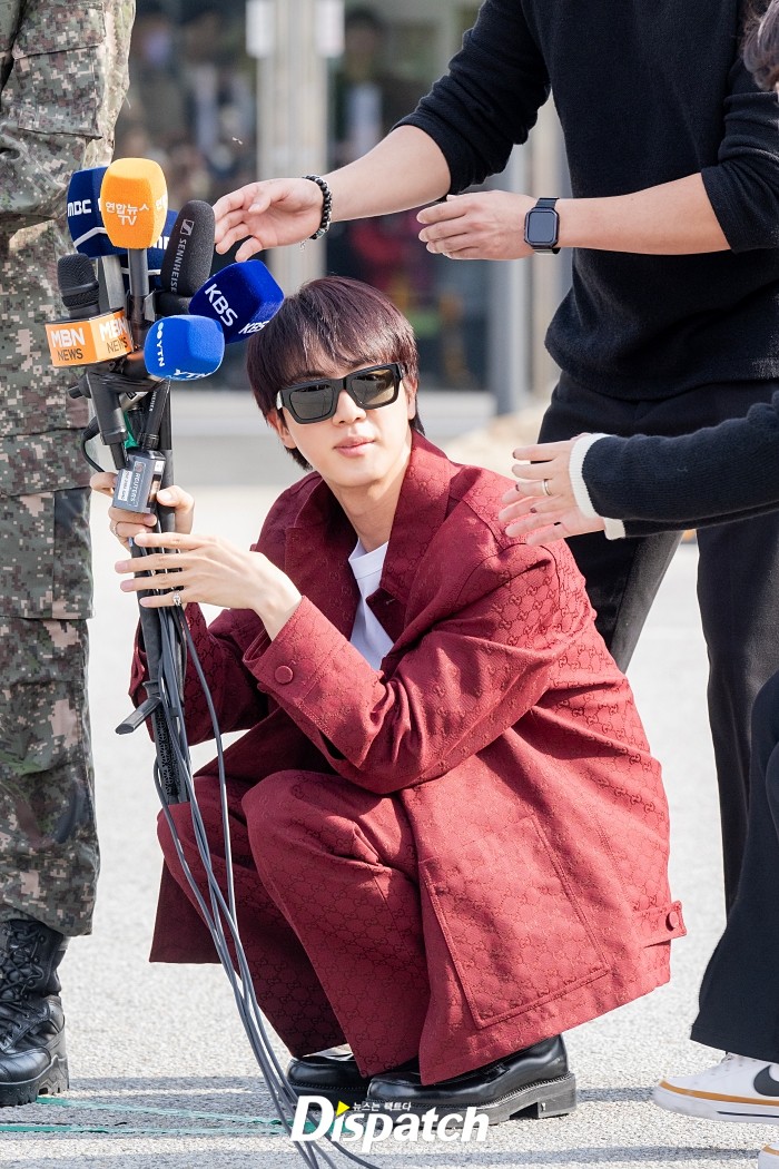 올해 6월 12일 방탄소년단 멤버 중 가장 먼저 제대한 진이 부대를 찾아 제이홉의 전역을 축하했다. 취재진의 마이크를 직접 들고 인터뷰를 기다리는 모습이었다.