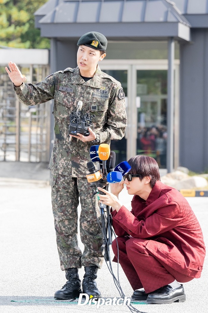 다수 취재진이 전역 현장을 찾았다. 제이홉은 이날 오전 10시 위병소 밖으로 나왔다. 마중 온 진의 환대를 받았다. 꽃다발도 품에 안았다.
