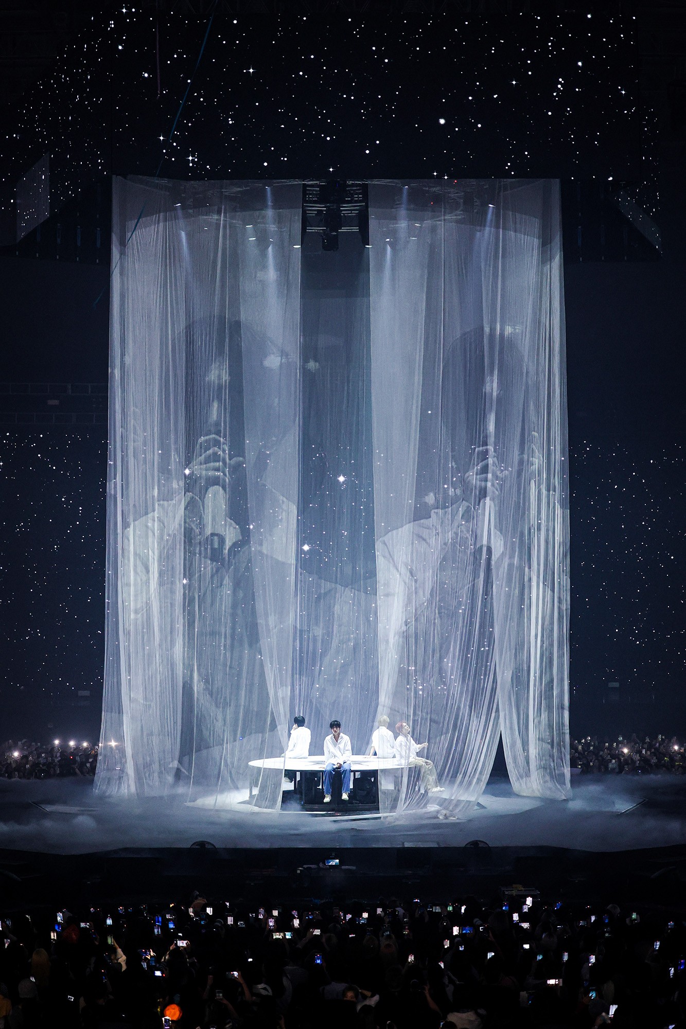 무대 끝, 팬들과 가까운 자리에 한 명씩 등장했다. 연준이 공중에 뜬 왕관을 머리에 쓰자 암전됐다. "모아, 스크림!" 휴닝카이 목소리에 단숨에 환호로 가득 찼다.