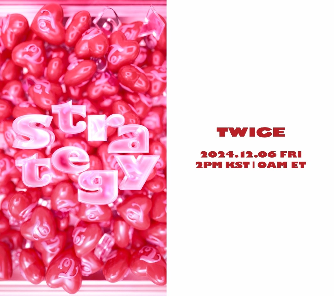 JYP엔터테인먼트 측은 11일 트와이스의 새 미니 앨범 '스트래티지'(STRATEGY) 로고 모션 영상을 게재했다. 다음 달 6일 동명의 타이틀곡을 발표할 것을 예고했다.