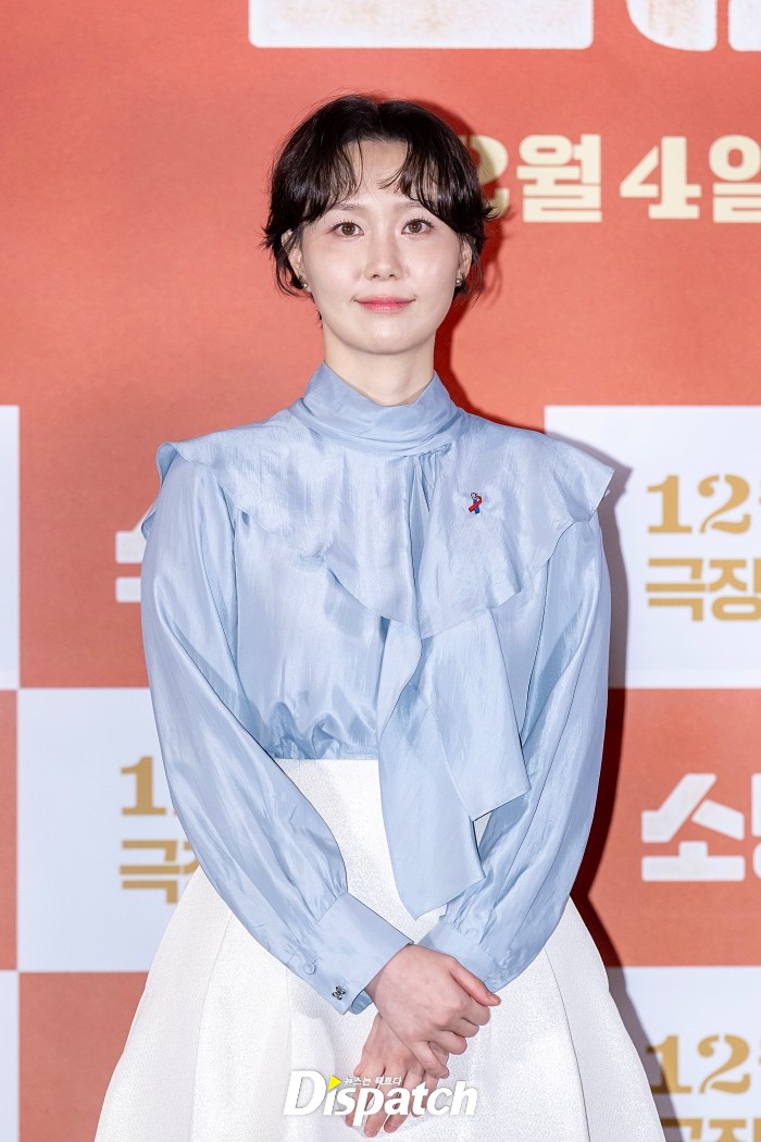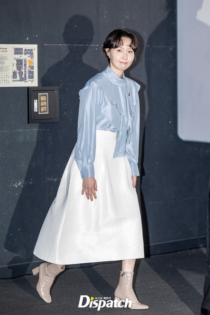 이유영은 블루 블라우스와 화이트 롱스커트로 청순한 자태를 뽐냈다. 출산 4개월만에도 건강하고 아름다운 미모를 뽐냈다.