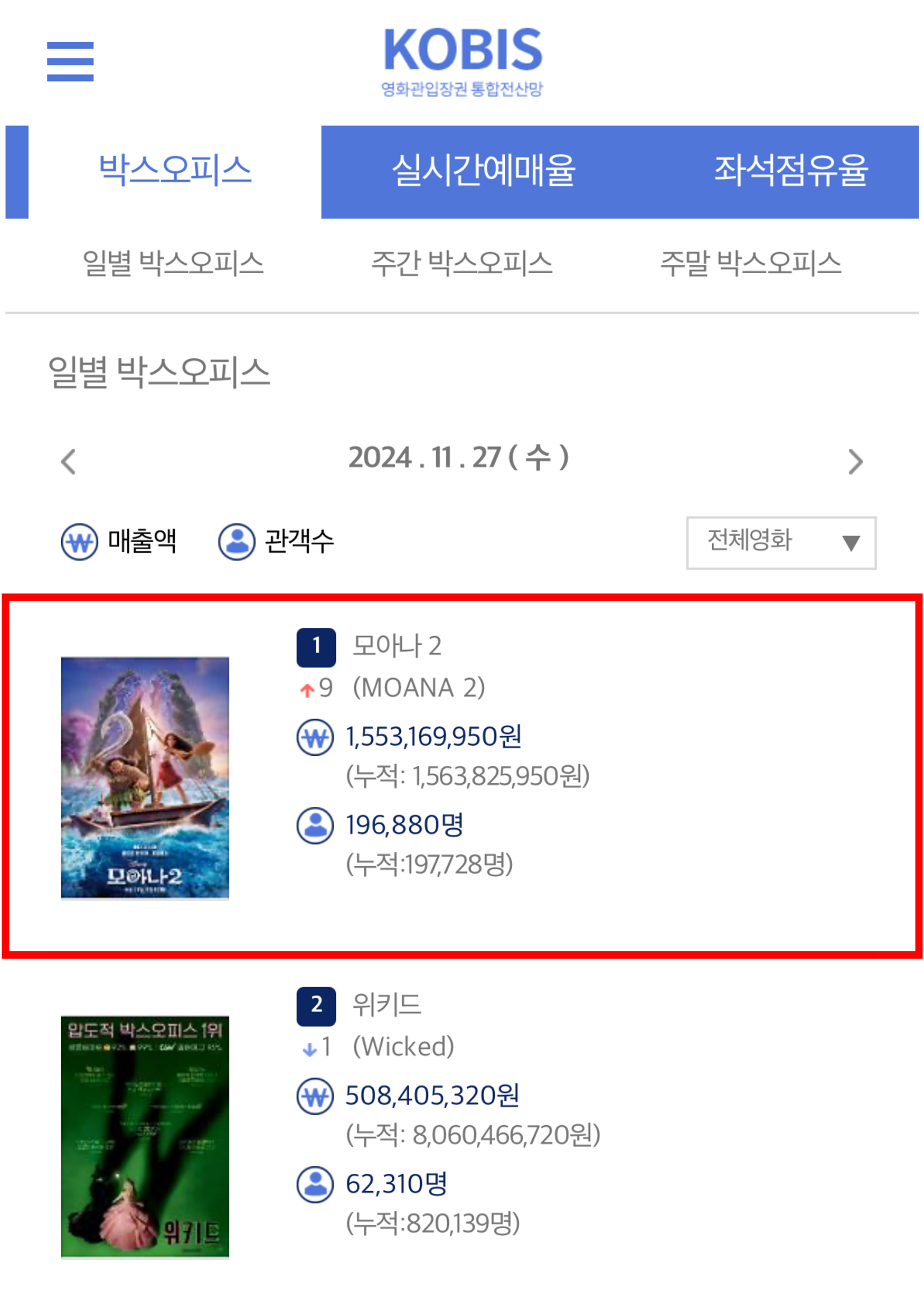 '모아나2'는 지난 일요일부터 4일 연속 전체 예매율 1위를 기록하고 있다. 감동적인 스토리와 용기를 북돋아 주는 위로의 메시지로 호평이 이어지고 있다.