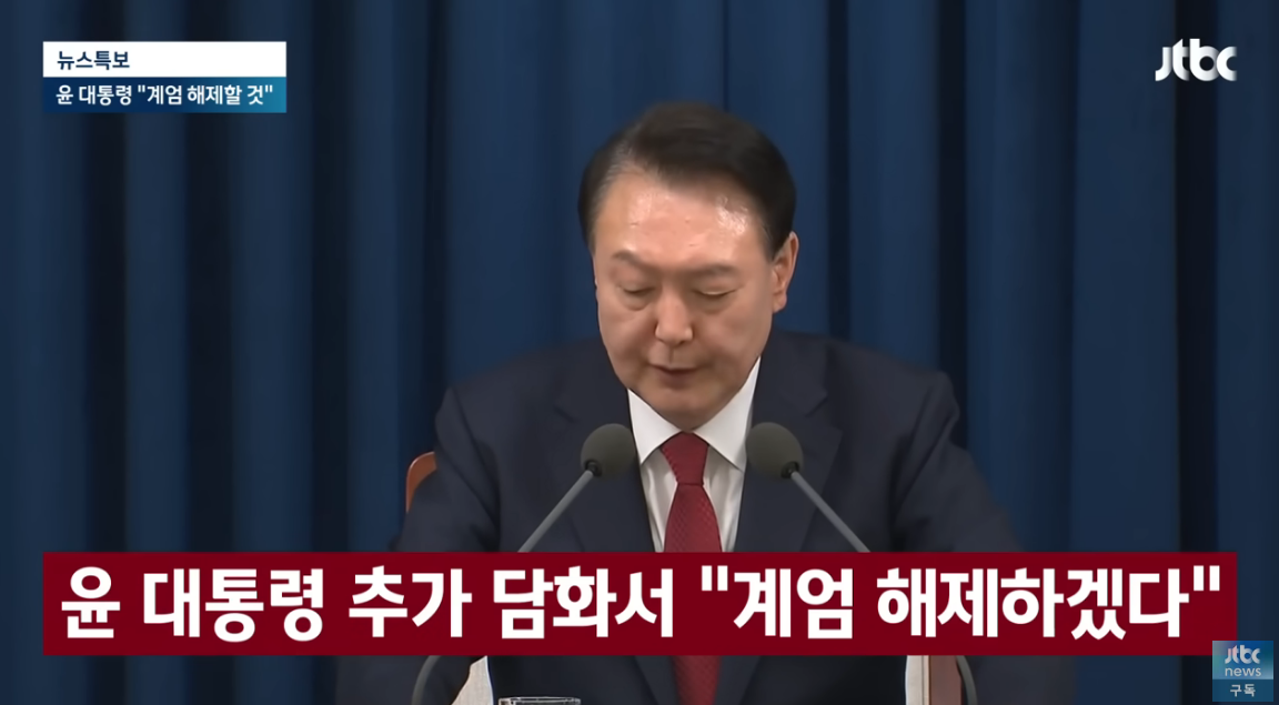 당시 707 특수임무단 등이 계엄군으로 국회에 진입해 전 국민을 충격에 빠뜨렸다. 윤석열은 계엄 선포 6시간 만에 "국회 요구를 수용해 계엄을 해제하겠다"고 발표했다.