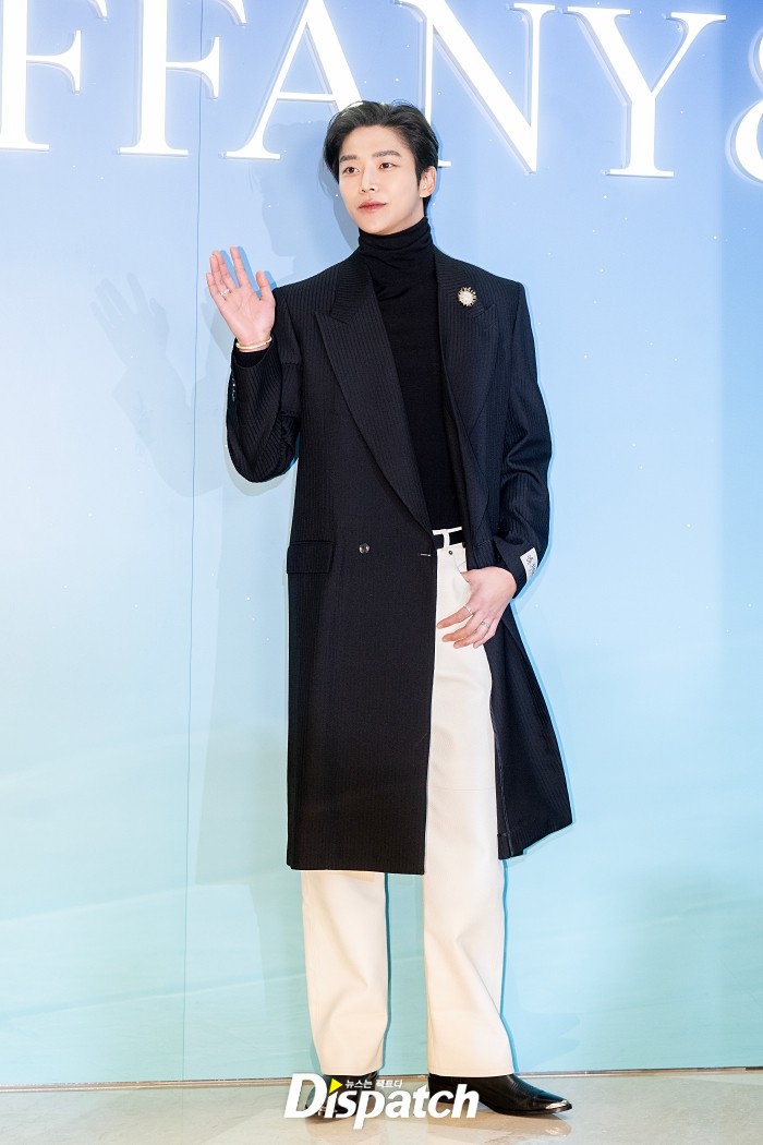 로운은 스트라이프 롱코트와 화이트 팬츠로 멋을 냈다. 잘생긴 비주얼이 돋보였다.