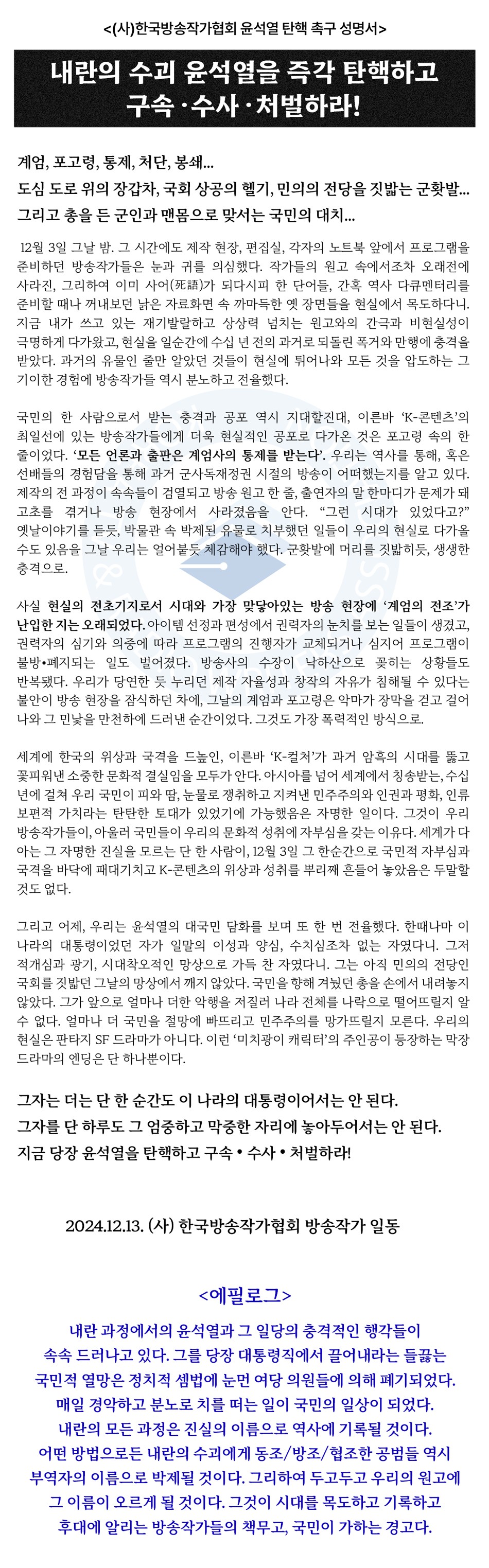 [Dispatch=김다은기자] 방송작가협회가 윤석열 대통령의 탄핵을 촉구했다.