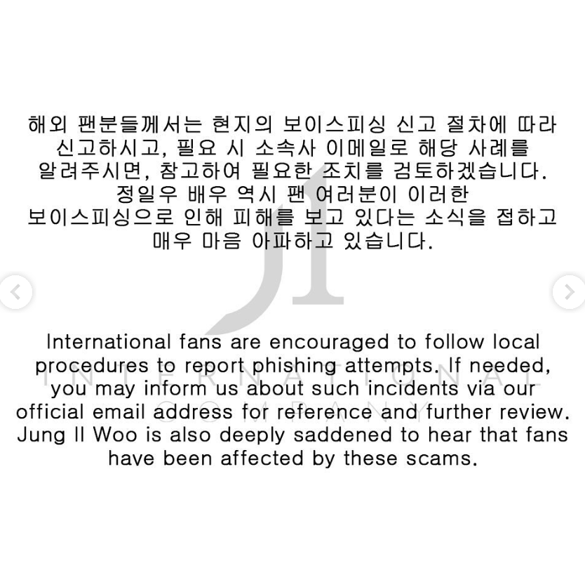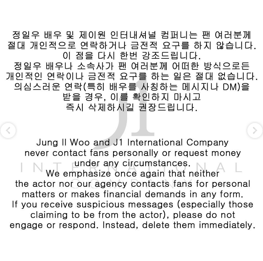 의심스러운 연락은 즉각 삭제를 당부했다. "당사와 정일우는 팬에게 절대 개인적으로 연락하거나 금전적 요구를 하지 않는다"고 강조했다.