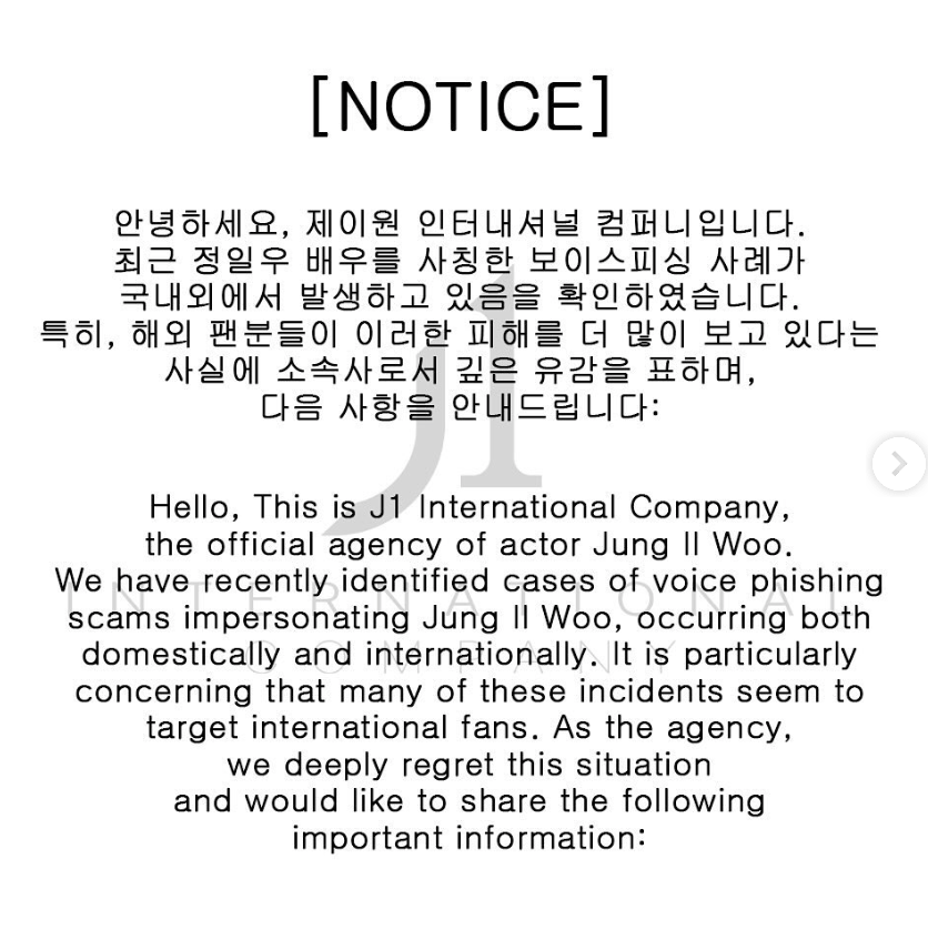 J1 인터내셔널 컴퍼니는 13일 "최근 국내·외에서 정일우 사칭 피해가 발생했다"며 "해외 팬들이 입은 큰 피해에 유감을 표한다"고 밝혔다.