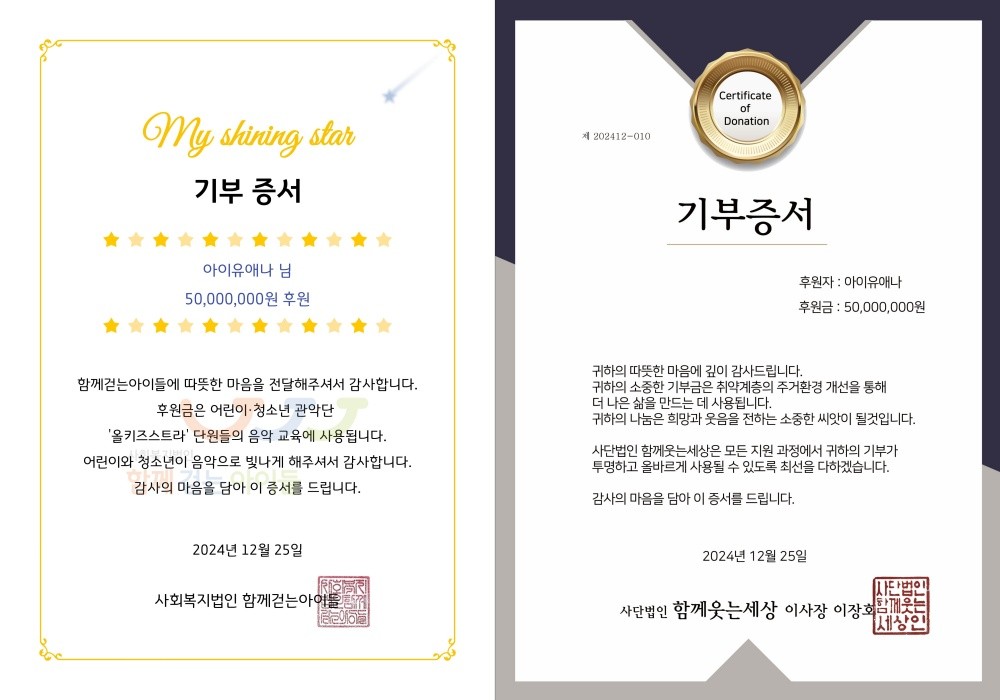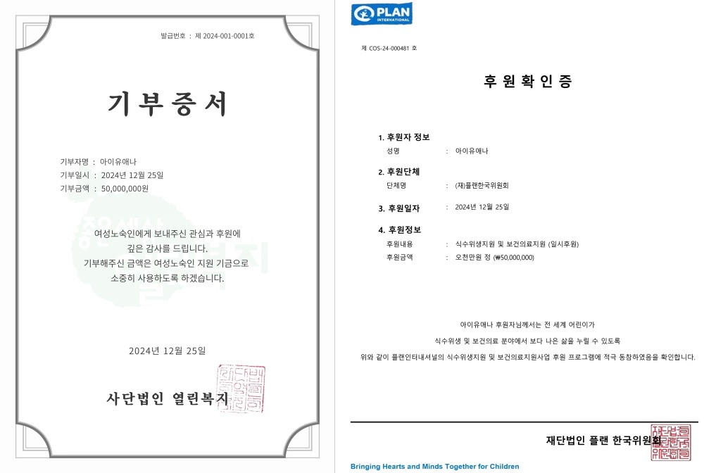 아이유는 그동안 데뷔 기념일, 생일, 연말 등 기념일마다 꾸준히 기부를 실천해왔다. 지난 9월에도 데뷔 16주년을 맞아 '아이유애나' 이름으로 2,500만 원을 기부했다.